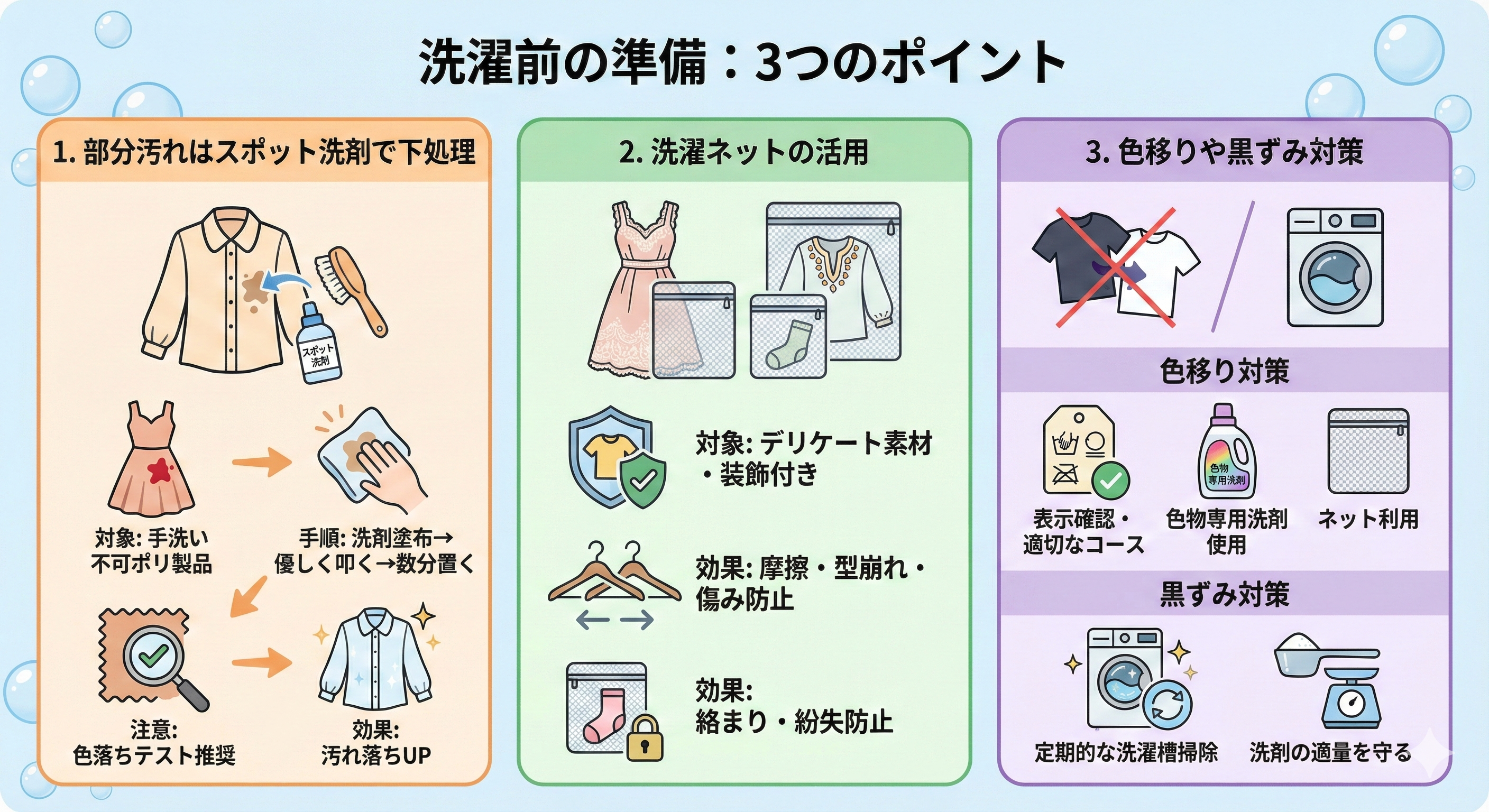 色移りや黒ずみを防ぐには、いくつかのポイントを押さえる必要があります。まず、色移りの主な原因は、濃い色の衣類から色が出て他の衣類に移ることです。これを防ぐためには、洗濯前に衣類の洗濯表示を必ず確認し、「手洗い」や「弱い洗濯コース」の指示がある場合は、それに従いましょう。衣類が縮む原因にもなるため、適切なコース選びは非常に重要です。また、色物専用の洗剤を使うことで、色落ちを抑えられます。さらに、洗濯ネットを利用すると摩擦を減らし、色移りやダメージを防げます。